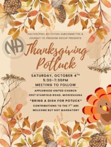 The Halton/Peel Activities Subcommittee together with the Journey to Freedom Group invites you to join us for an evening of gratitude, connection, and fellowship at our NA Thanksgiving Potluck!